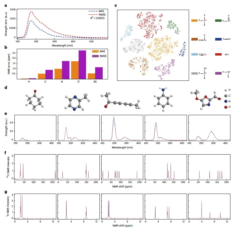 紫外-可见(UV-Vis)和核磁共振(NMR)光谱的模拟:对于UV-Vis光谱,标准的模拟算法需要估计吸收能量和跃迁偶极矩。DetaNet在预测吸收能量方面表现良好,但在振子强度的预测方面表现不佳,因为其仅基于基态结构。因此,作者采用了另一种方法直接预测1.5-13.5 eV(92-827 nm)范围内的广泛UV-Vis光谱。如图2e所示,五种代表性分子(环己酮、2-甲基吡嗪、庚-3,5-二炔-2-酮、苯胺和5-甲氧基-1,3-噁唑-2-羰基醛;结构见图2d)的DetaNet预测UV-Vis光谱与DFT结果几乎一致。此外,与DFT结果相比,DetaNet预测的吸收强度的平均绝对误差(MAE)小于0.012原子单位,R2大约为92.04%(见图2a),这证明了DetaNet在模拟UV-Vis光谱方面的准确性。对于NMR光谱,DetaNet预测了氢、碳、氮和氧原子的各向同性磁屏蔽张量和相应的化学位移值。如图2f,g所示,五种代表性分子的DetaNet预测的13C和1H NMR光谱与DFT参考数据非常接近。图2c展示了100,000个具有八种不同氢环境的氢原子形成的紧密且清晰分离的簇,这表明DetaNet能够准确地模拟化学环境,从而精确预测NMR光谱。