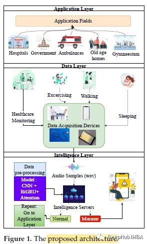 数据层,处理实时数据采集,如数字或模拟听诊器,机电薄膜(EMFi)传感器,智能手机。