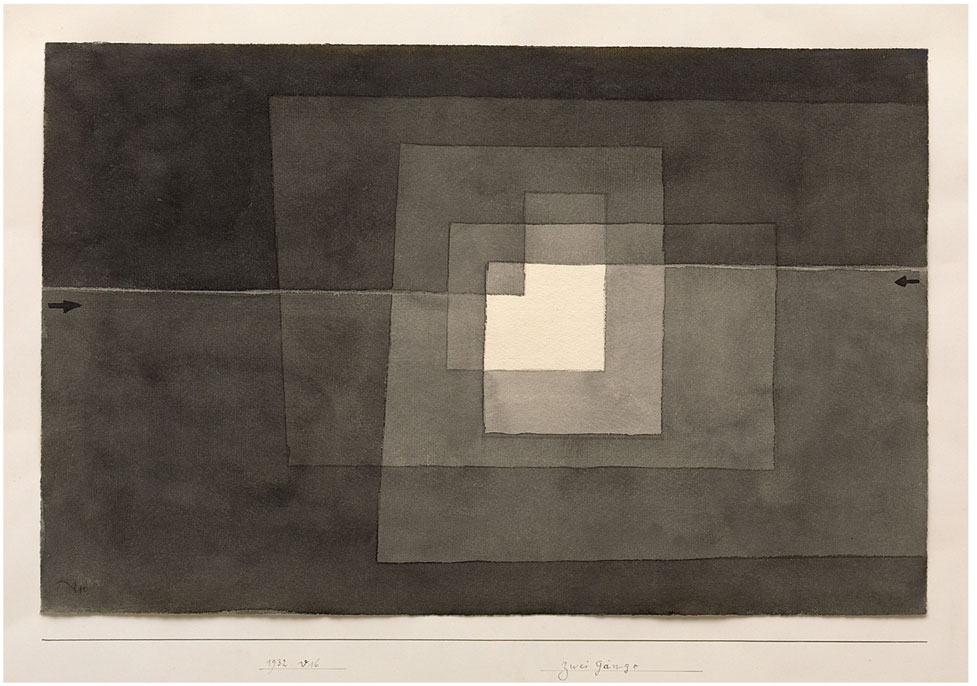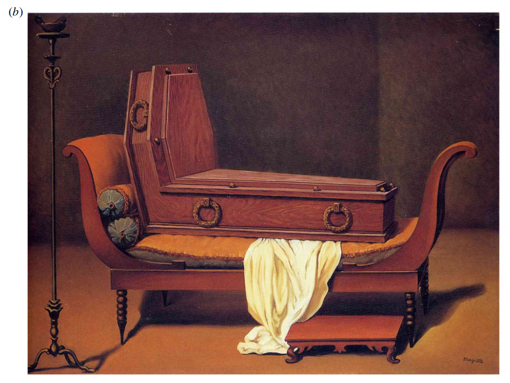 图 5.(a) Paul Klee 的 Zwei Gänge。 (b) 透视:马格利特的雷卡米耶·德大卫夫人。克利和马格里特的这些作品表明,暂时的发现是通过持续存在的不协调而无法找到最终解决方案而实现的。在感知层面上,克利在他的矛盾的、多稳定的图像中明确地、有意识地利用了眼睛的局限性,以及它对认知行动来解决不确定性的需要,正如这句话中显而易见的那样:“眼睛的局限性在于它的局限性”。甚至无法看到一个小表面在所有点上都同样清晰。眼睛必须“掠过”表面,敏锐地抓住一个又一个的部分,将它们传送到收集和存储印象的大脑[77,p.11]。 33]。在概念层面上,马格利特还通过躺椅上的棺材的奇怪性来引发推论和认知行为(同样,大卫的原作的先前经验或马格利特的其他观点为搜索提供了信息):这是一个简单的死亡纪念吗?是某种绘画风格或绘画方式的象征性死亡吗?委托拍摄此类肖像是否是对上层阶级短暂价值观的幽默解构?任何解释都不可能完全解决问题(幸运的是,从我们的角度来看也是如此)。 (在线版本为彩色。)