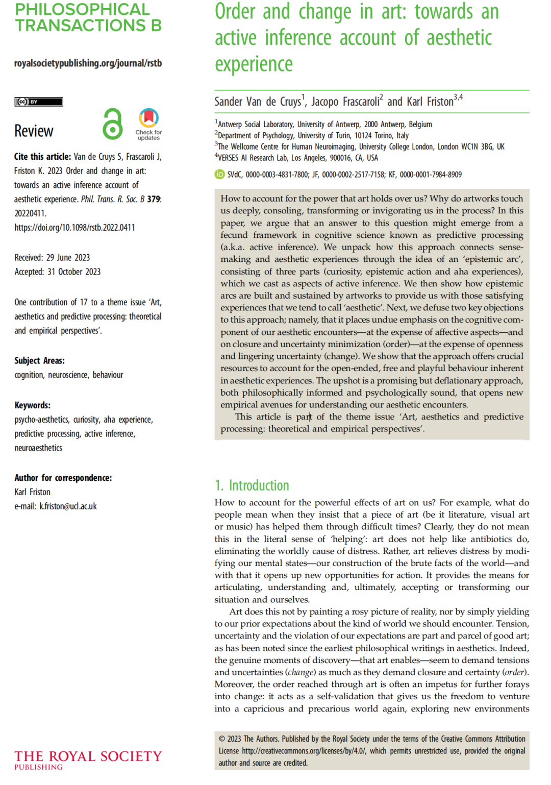 在本文中,我们尝试使用预测处理(PP;又名主动推理 predictive processing PP; a.k.a. active inference)框架,对我们的艺术体验和更广泛的审美体验的这些方面进行新的阐述。乍一看,这个框架认为生物主体受最小化不确定性的唯一命令的支配,似乎与刚才描述的丰富审美体验的可能性完全不一致。事实上,它似乎与所有启发我们存在的艺术、有趣和创造性的追求背道而驰。