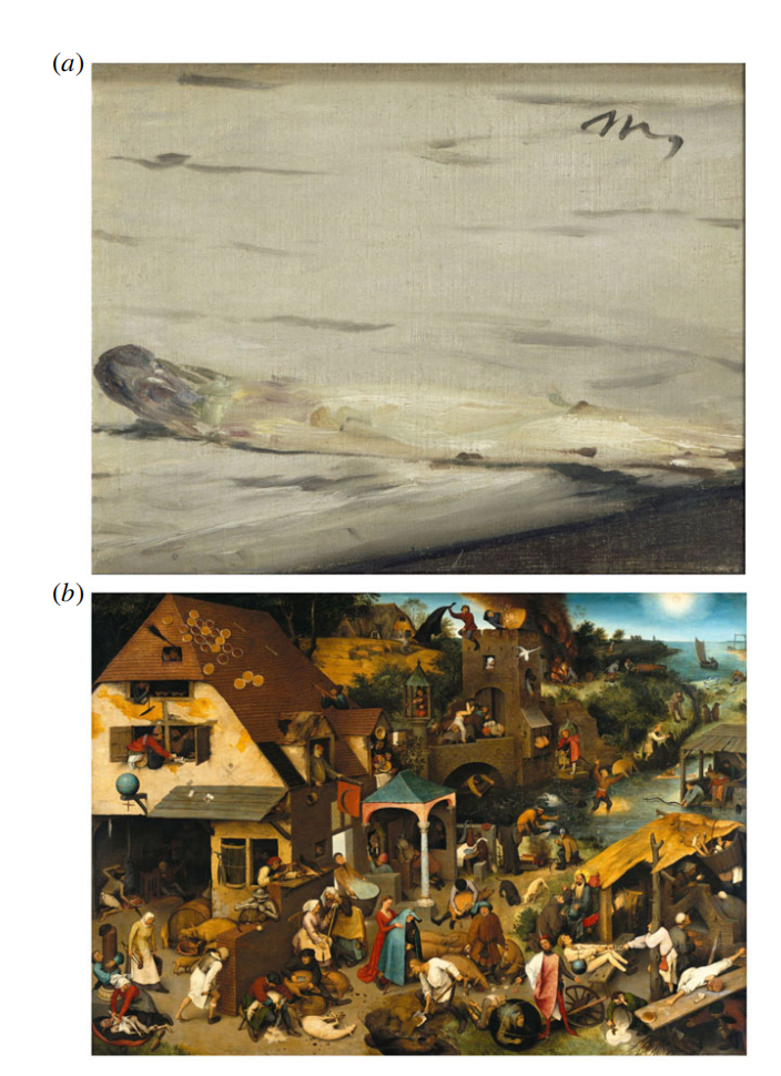 图 3.(a) 爱德华·马奈 (Édouard Manet) 的《LAsperge》。 (b) 彼得·勃鲁盖尔·德·奥德 (Pieter Bruegel de Oude) 的 Nederlandse Spreekwoorden。这两幅画都允许一个解谜的时刻,从而产生明确的封闭,无论是在感知层面(马奈:感知组织和所描绘的对象的发现)还是在概念层面(勃鲁盖尔:对象的分组和发现所描绘的谚语)。在这两种情况下,自上而下的预测(例如对荷兰/佛兰德语言和美食的熟悉程度)对于发现以及欣赏绘画至关重要。马奈通过违反相似性分组(物体与背景之间缺乏对比)来增加不确定性,勃鲁盖尔则通过拥挤的地方和熟悉谚语的字面描述的纯粹怪异(违反期望)来增加不确定性。 (在线版本为彩色。)