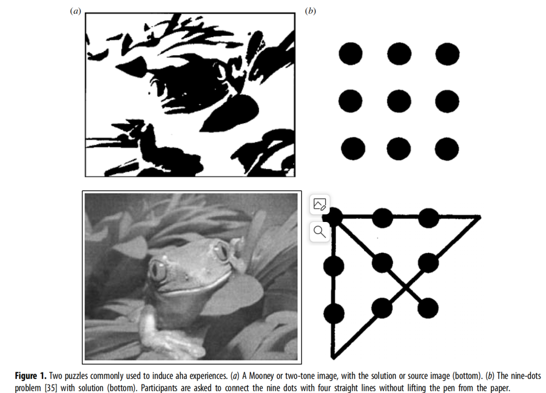 在这种顿悟经历之前通常会出现一个僵局,即一个不确定的阶段,在这个阶段,我们尽管付出了一些努力,仍难以理解情况或解决问题。通常引起顿悟时刻的“谜题”在他们的脸上通常足够简单(例如具有一些可识别形状的穆尼图像、远程关联任务中的三个常见单词或九点任务中的九个点;参见图 1 中的示例1 [35‑37]),因此我们有足够的好奇心与他们接触并致力于认知行为以收集更多信息。我们认为解决方案指日可待。