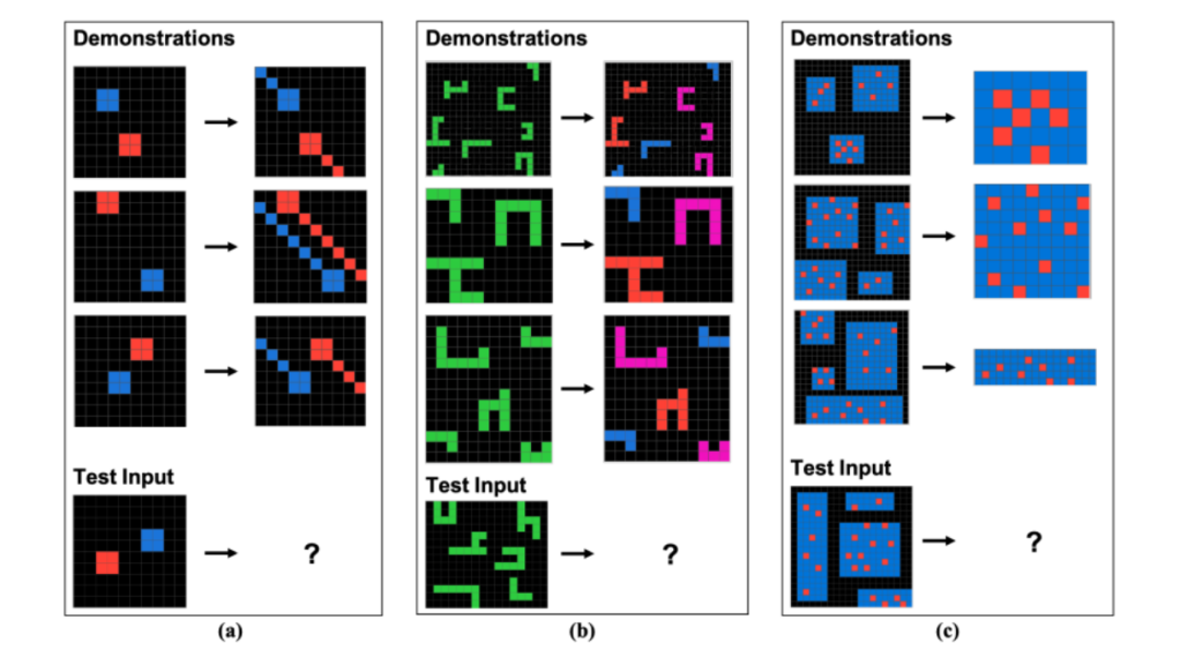 挑战者的任务是归纳出演示的基础抽象规则,并将该规则应用于测试输入,生成一个经过变换的网格。