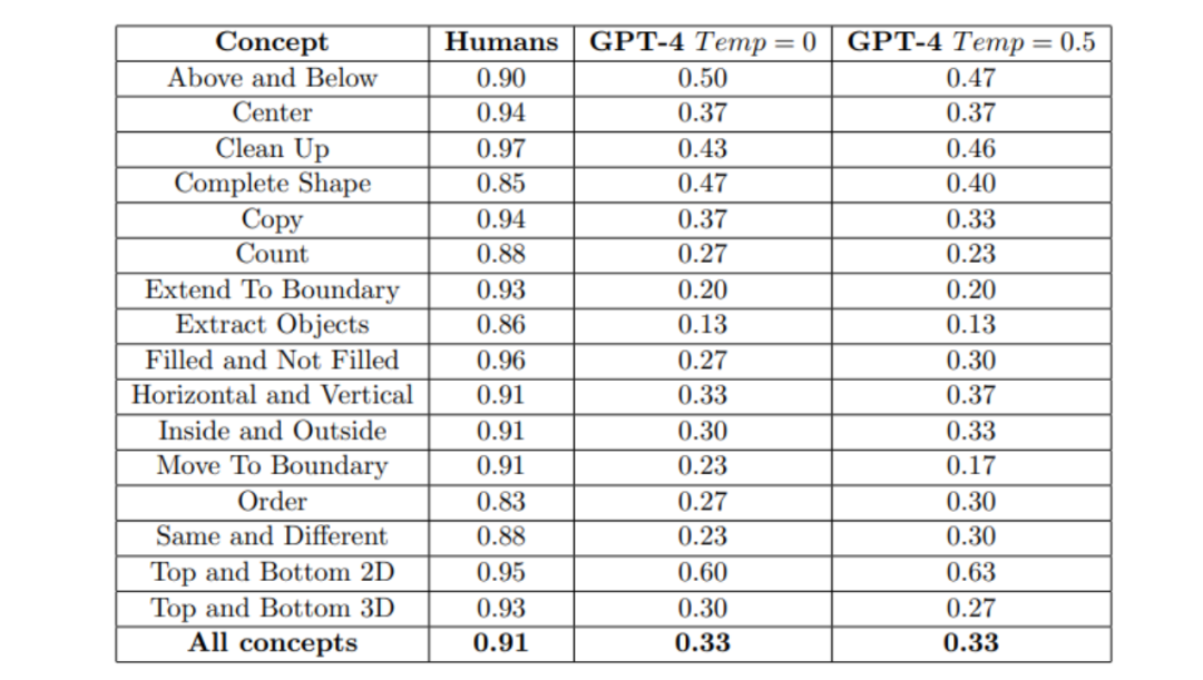 这不难得出结论,GPT-4,可能是目前最强大的通用LLM,仍然无法稳健地形成抽象并推理关于基本核心概念的内容,而这些概念出现在其训练数据中之前未见过的上下文中。