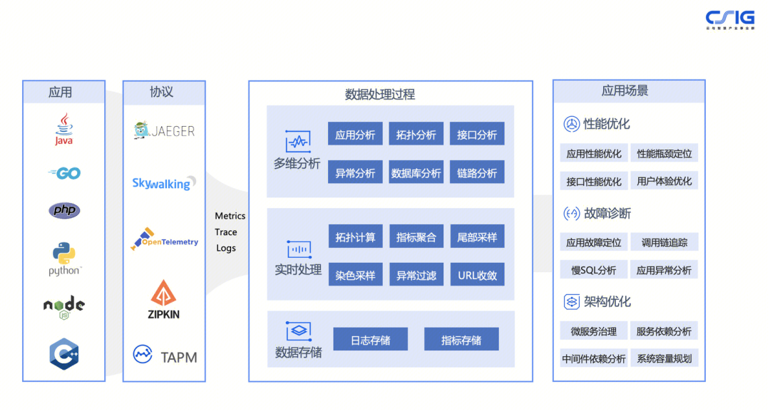 上面这张图是腾讯云应用性能监控(APM)的技术架构图,左侧是数据采集层,中间是数据处理层,最后侧是数据展示层。