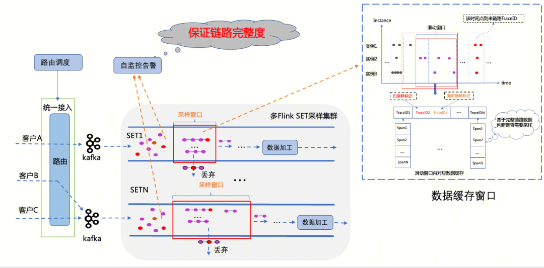 下面结合尾部采样的原理,为大家介绍一下在实际生产环境中通过尾部采样+滑动窗口的机制实现错、慢链路全采的技术方案。