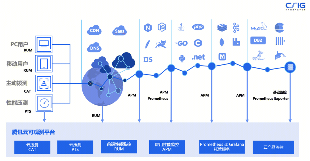 腾讯云可观测平台 (TCOP) 包含了云拨测 (CAT),云压测(PTS)、前端/终端性能监控 (RUM)、应用性能监控 (APM)、Prometheus & Grafana 服务、以及云产品基础监控等多个子产品,经过往几年产品的打磨与积累,在可观测领域已经形成了相对比较完整的产品矩阵,并且同时服务于腾讯集团内部和外部客户,逐步打造成一体化、高效能、低成本的可观测平台,且会进一步提升产品的被集成能力,能够更好被云服务使用者所集成,持续的为广大企业用户提供高质量的产品及服务,帮助更多的企业客户在日常系统能够借助可观测产品的力量,提升研发运维的效能管理,通过可观测的数据,实时发现系统的性能瓶颈,并且通过数据化的方式驱动企业内不同角色的协作与沟通,提升整体的企业运作效率,腾讯云可观测平台将会不断提供更多的优质产品与服务。