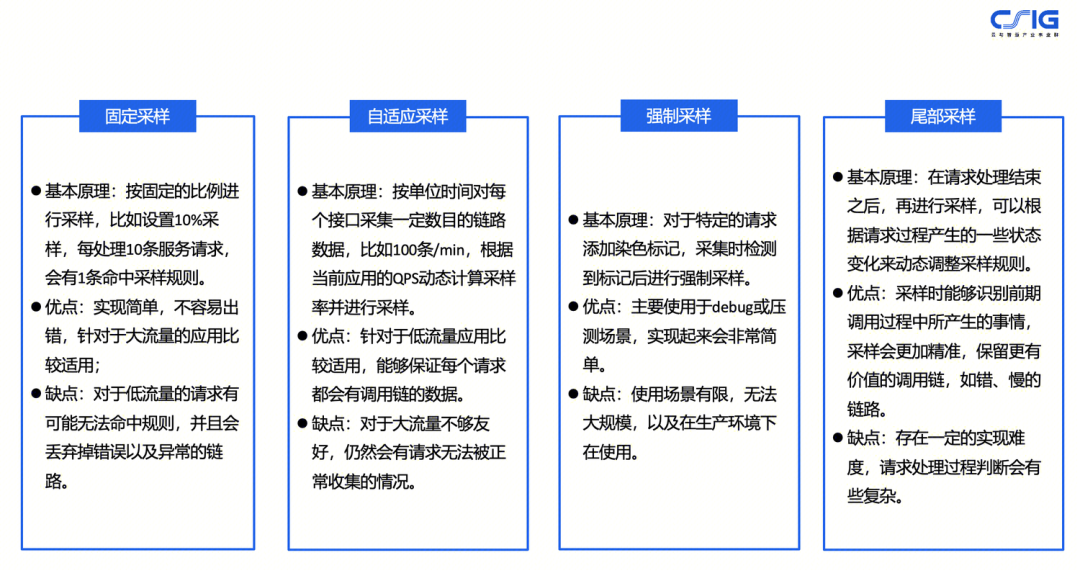 通过实现错、慢调用链路全采样,实现数据价值的最大化。下面介绍几种常见的调用链路采样策略,分别为固定采样、自适应采样、强制采样、以及尾部采样。