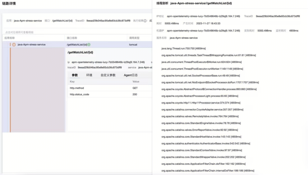 腾讯云应用性能监控(APM)的采集探针针对于 OpenTelemetry 进行了大量的二次开发与能力增强,不仅兼容了开源原生的采集能力,还能够针对一些慢调用的场景,自动抓取调用堆栈信息,从调用上下文中获取 TraceId 的信息,并与之进行关联形成信息互补,当遇到慢调用的场景时,能够通过调用链原始的 Span 信息,与调用堆栈信息结合,快速找到问题的性能瓶颈。