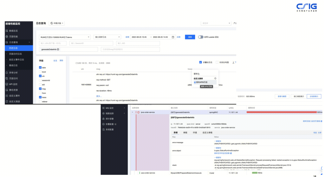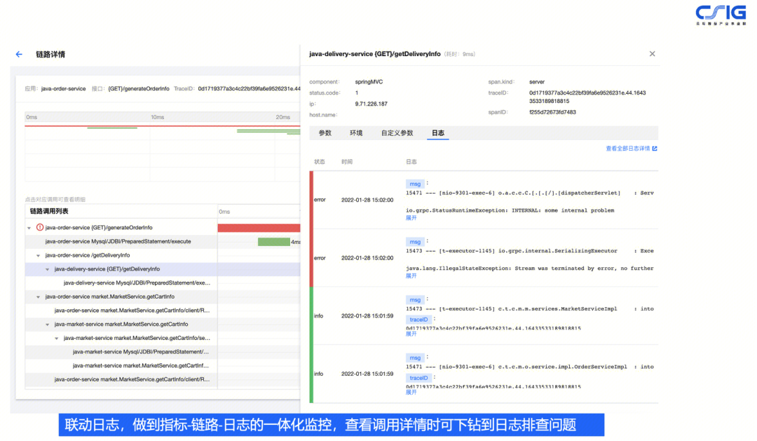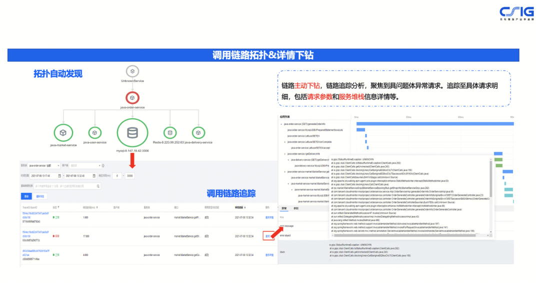 从应用拓扑到调用链,实现链路的错、慢下钻分析,这是一个经典的使用可观测平台实现的产品能力,通过拓扑图可以看到有异常的应用信息,选中该应用之后,可以关联到调用链的明细的数据,在调用链的界面我们可以看到出现了慢的调用,或者是错误的调用,打开调用链的详情之后,可以进行下钻分析,看到此次调用的请求参数,以及调用堆栈和运行时产生的异常信息。