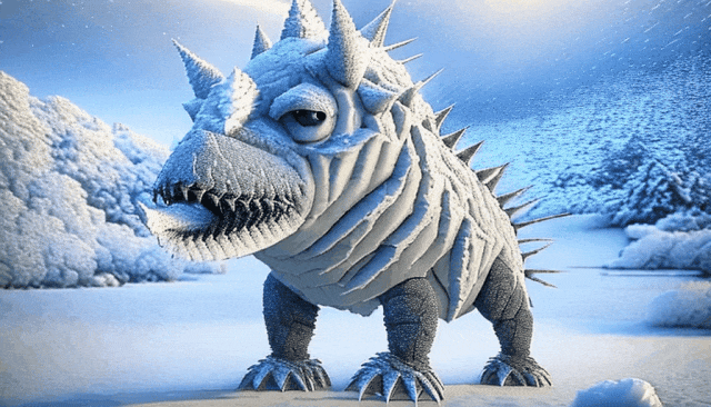 提示词:生成在冰雪覆盖的土地上有一只冰霜般的大生物的视频。