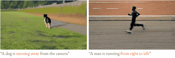在半监督设定下的 TF-T2V 方法还可以生成符合运动文本描述的视频,如 「人从右往左跑」。