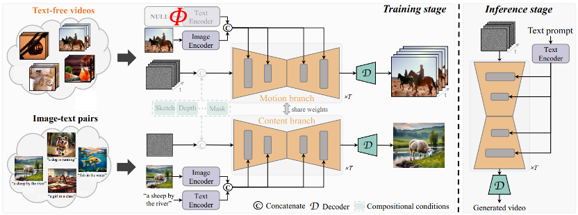 TF-T2V 的核心思想是将模型分为运动分支和表观分支,运动分支用于建模运动动态,表观分支用于学习视觉表观信息。这两个分支进行联合训练,最终可以实现通过文本驱动视频生成。