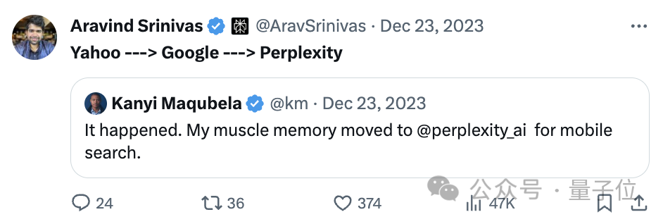 Aravind Srinivas年前还有“Yahoo→Google→Perplexity”这样婶儿的“公开叫板”: