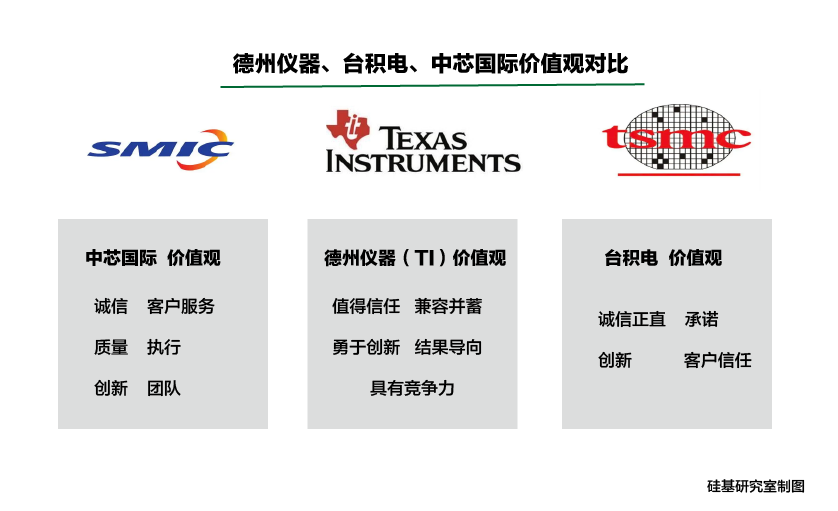 两人在德州仪器的经历,让他们都认识到一套严格的美式管理办法以及企业价值观的重要性。例如,张忠谋以诚信正直(integrity)、承诺(commitment)、创新(innovation)、客户信任(customer trust)这四种核心价值来约束台积电,而中芯国际的价值观则是「诚信、客户服务、质量、执行、创新、团队」。