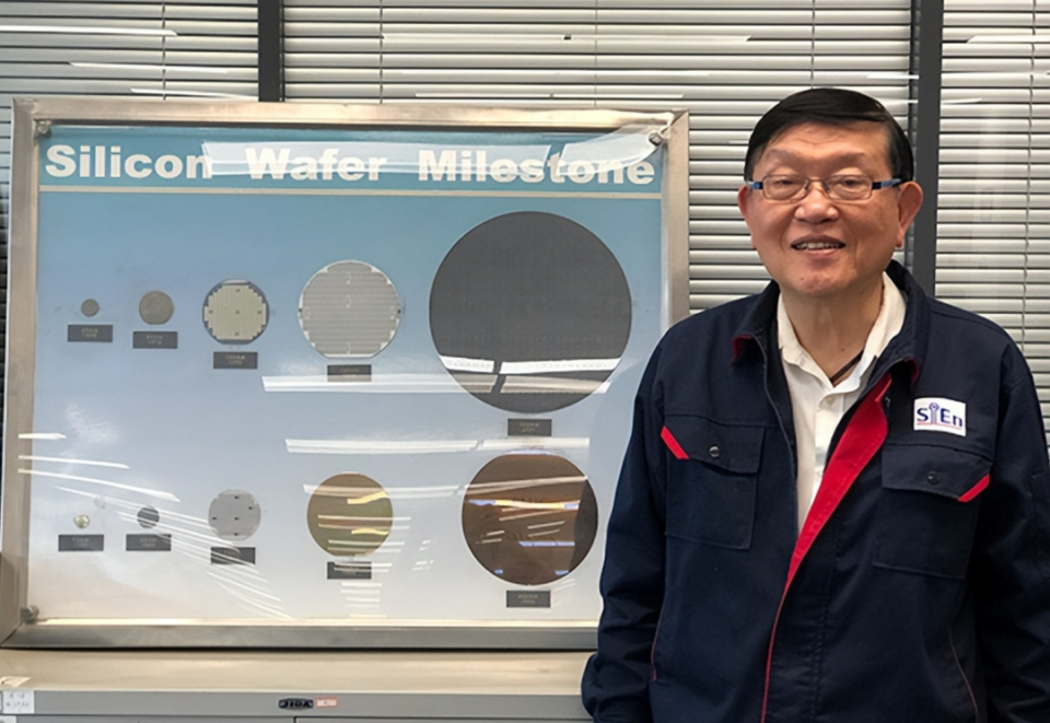 张汝京穿着芯恩的工作服,展示他的「宝贝们」
