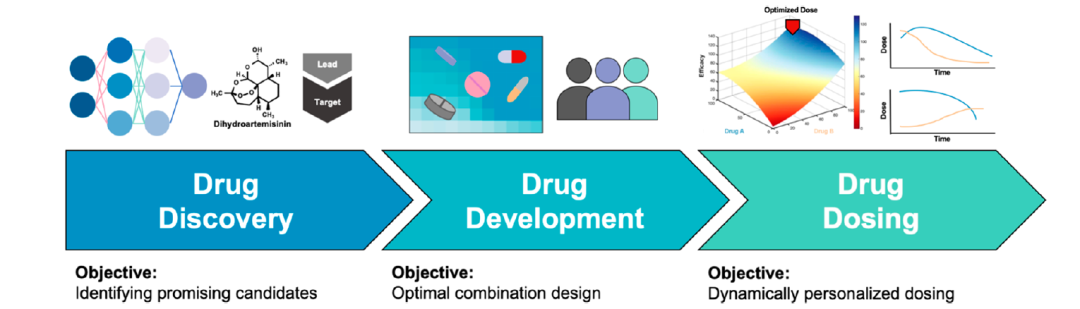 这项工作代表了深度学习在快速药物发现中角色的重要验证。在评估人工智能(AI)驱动治疗的更广泛角色时,重要的是要注意,药物发现只是包括药物开发(涉及药物组合设计等因素)和药物剂量计算在内的更大的药物优化工作流程的一部分(图1)。作为一个完整的工作流程,这三个部分可以深刻影响临床操作性和患者对单药或联合方案的持续反应。