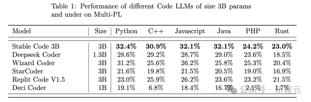 上表中,Stable Code 3B与同等规模的编码模型进行比较,在全部的六种编程语言中,都处于领先。