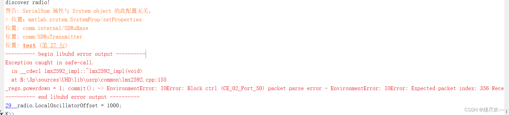 Checking radio connections… ---------- begin libuhd error output ---------- Exception caught in safe-call. in __cdecl ctrl_iface_impl<0>::~ctrl_iface_impl(void) at B:\3p\sources\UHD\lib\rfnoc\ctrl_iface.cpp:52 this->send_cmd_pkt(0, 0, true); -> EnvironmentError: IOError: Block ctrl (CE_01_Port_40) packet parse error - EnvironmentError: IOError: Expected packet index: 425 Received index: 426 ---------- end libuhd error output ---------- discover radio! 警告: SerialNum 属性与 System object 的此配置无关。 位置:matlab.system.SystemProp/setProperties 位置: comm.internal/SDRuBase 位置: comm/SDRuTransmitter 位置: test (第 24 行)