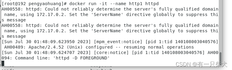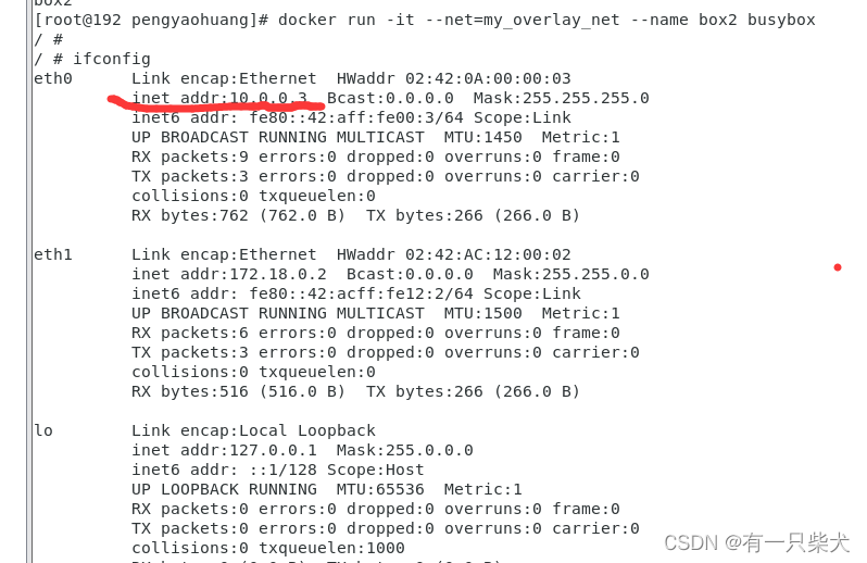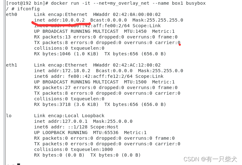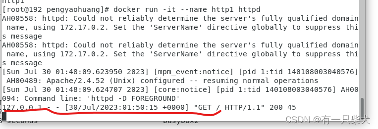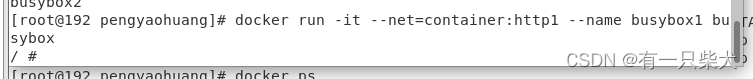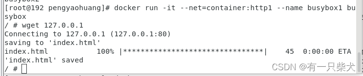 2)基于busybox镜像创建一个新的容器,busybox1,并通过参数--net=container:http1,指定与“http1”容器通信。