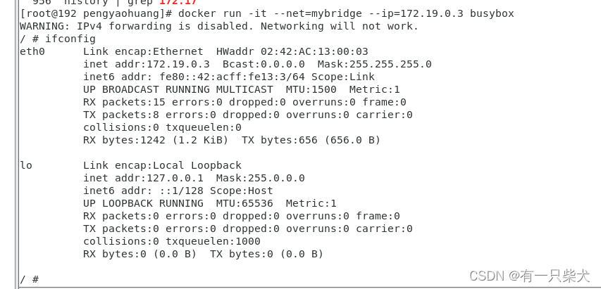 docker run -it --net=mybridge --ip=172.19.0.3 busybox