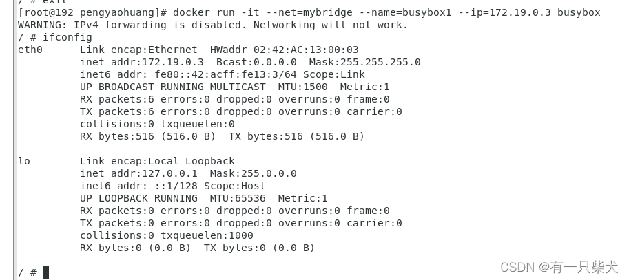 docker run -it --net=mybridge --ip=172.19.0.4 busybox