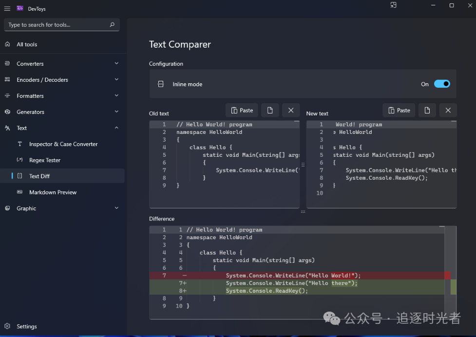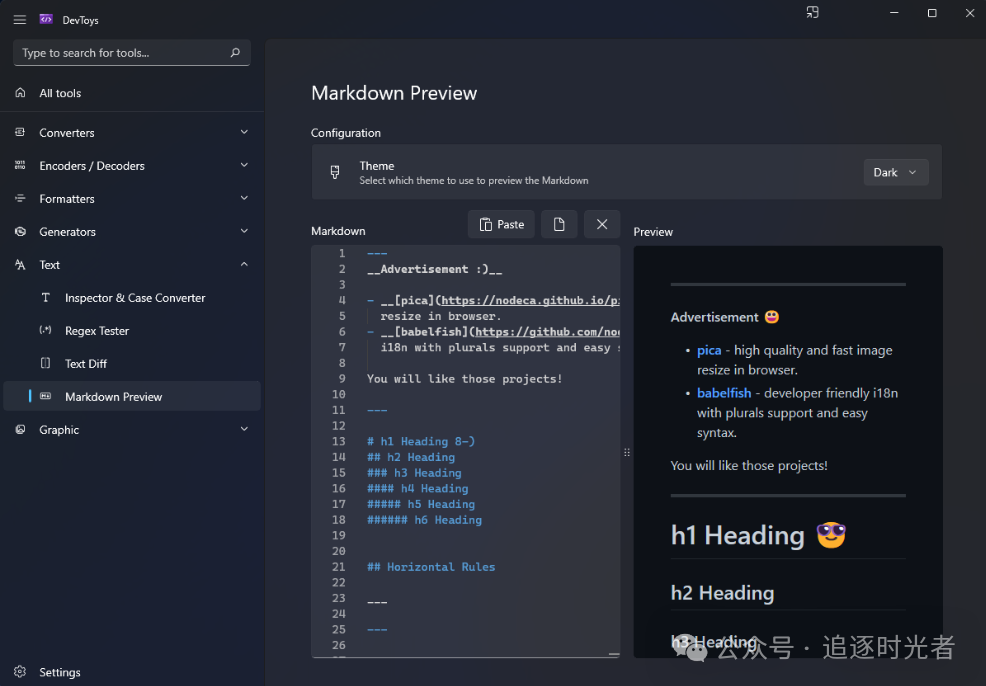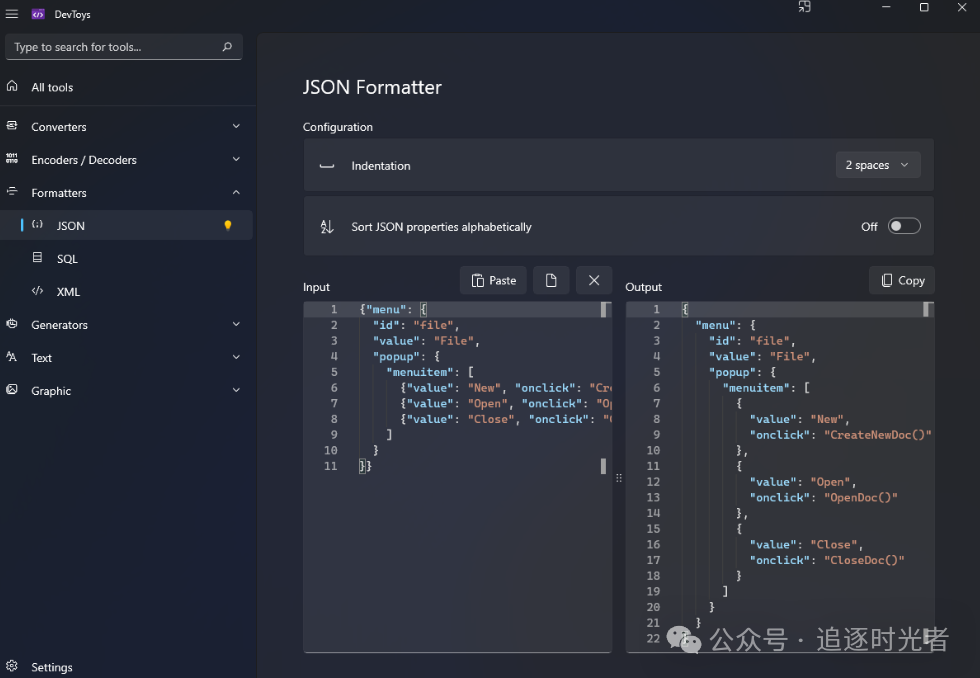 DevToys是一个专门为开发者设计的Windows工具箱,完全支持离线运行,无需使用许多不真实的网站来处理你的数据,常用功能有:格式化(支持 JSON、SQL、XML)、JWT解码、URL编码/解码、UUID生成、图片压缩、文本比较、正则表达式测试、Markdown预览等28+种实用工具。