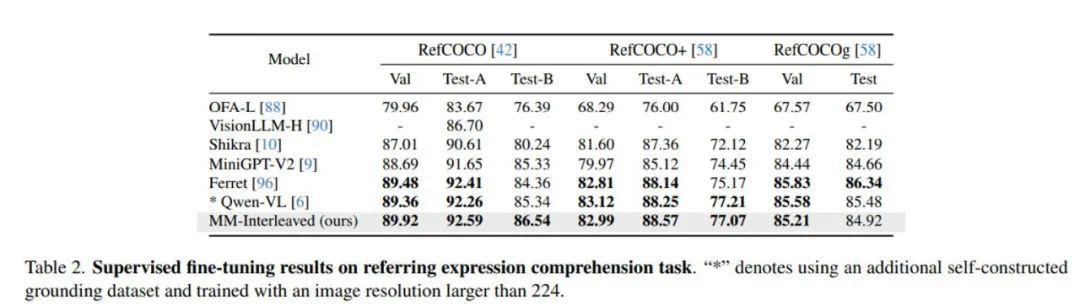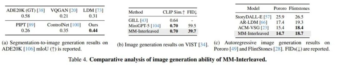 表 2 和表 4 展现了 MM-Interleaved 在进行进一步微调后的实验结果,其在指代理解、基于分割图生成图像、图文交错生成等多个下游任务上的性能也十分优异。