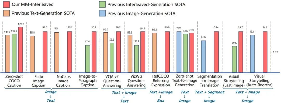 这表明 MM-Interleaved 不仅在预训练阶段表现出色,而且在具体任务微调后依然能够保持领先地位,从而为多模态大模型的广泛应用提供了可靠的支持。