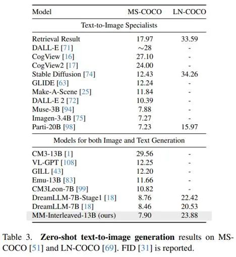 如表 1 和表 3 所示,MM-Interleaved 在零样本多模态理解和生成任务上均取得了卓越的性能。这一成就不仅证明了该框架的强大能力,也突显了其在应对多样化任务时的强大通用性。