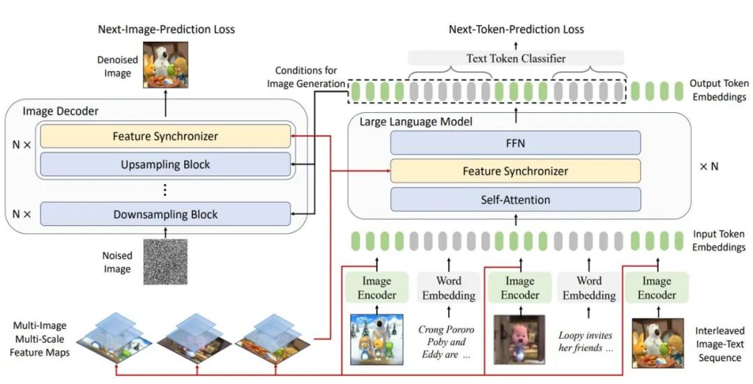 此外,MM-Interleaved 的关键实现还包括一个通用的多模态特征同步器(Multi-modal Feature Synchronizer)。