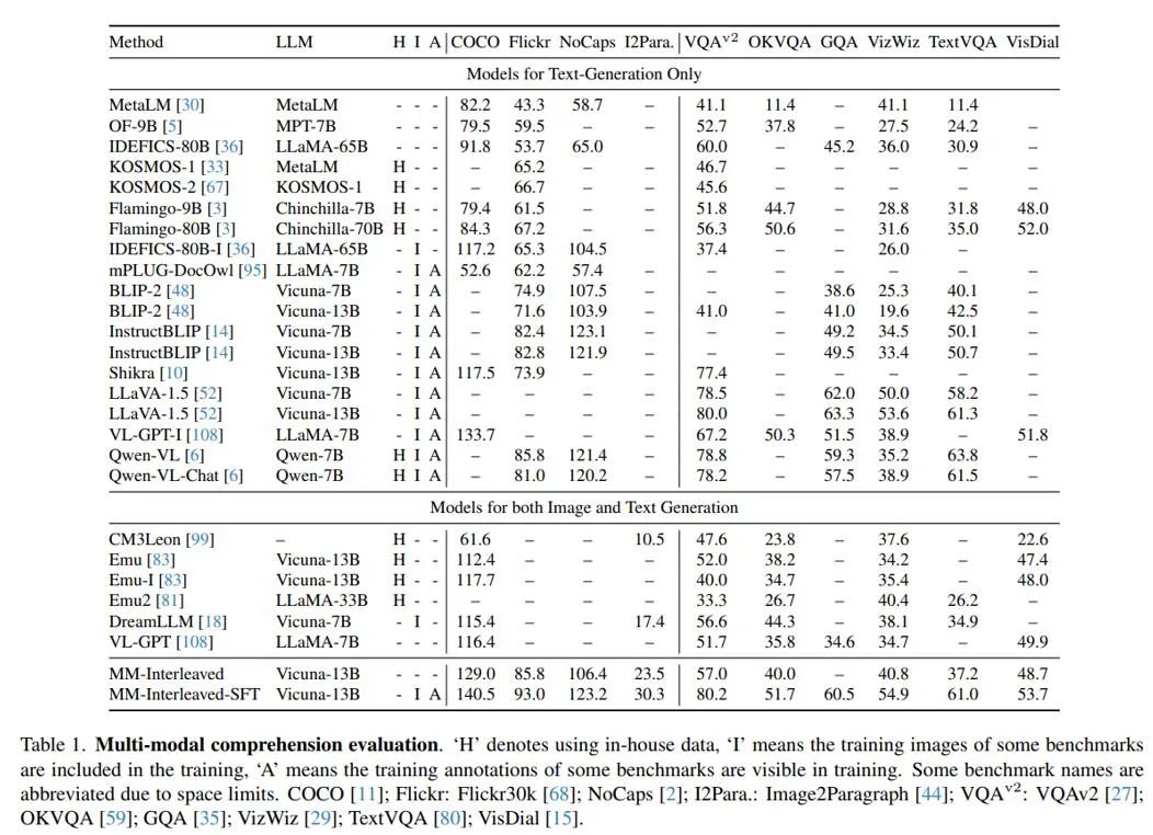 基于 MM-Interleaved 训练的模型,在参数量更少、不使用私有数据的情况下,不仅在多个零样本多模态理解任务上表现优越,领先于国内外最新研究工作,如 Flamingo、Emu2 等。