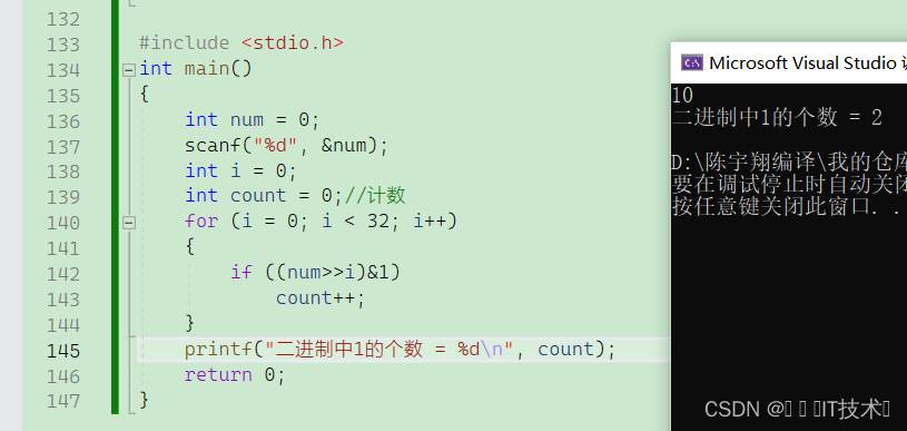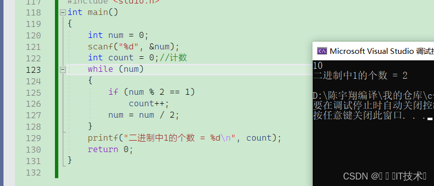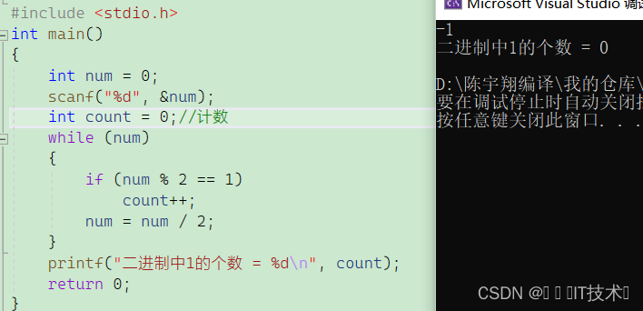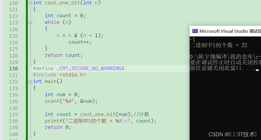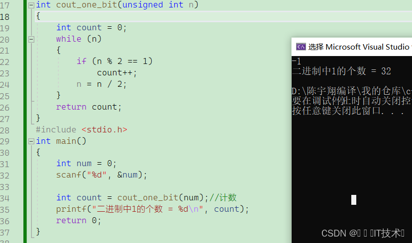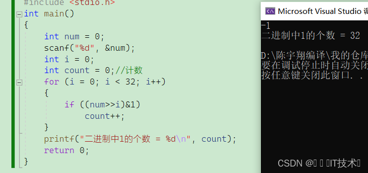 但我们发现输入-1得到的结果是错的,这里需要考虑负数的问题,所以我们要想统计负数的二进制1的个数,需要用到unsign int 因为unsign int 会把符号位也当成数值位,所以-1 的二进制编码为11111111 11111111 11111111 11111111每一位均为数值位得到4294967295,可以进行%10和/10的操作!