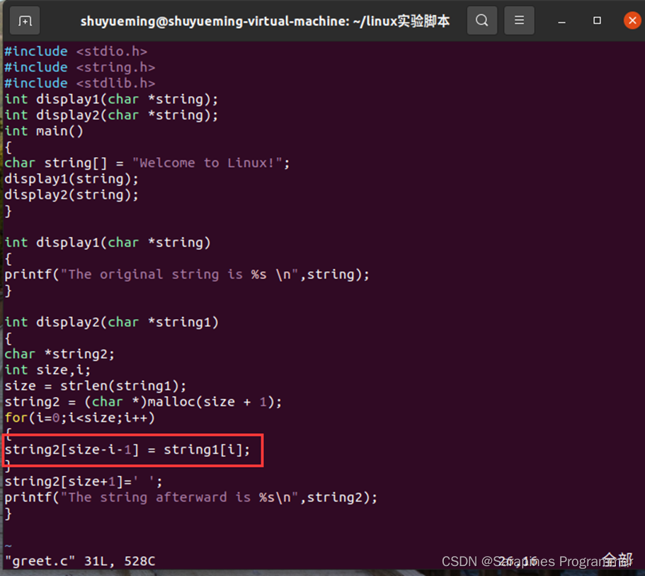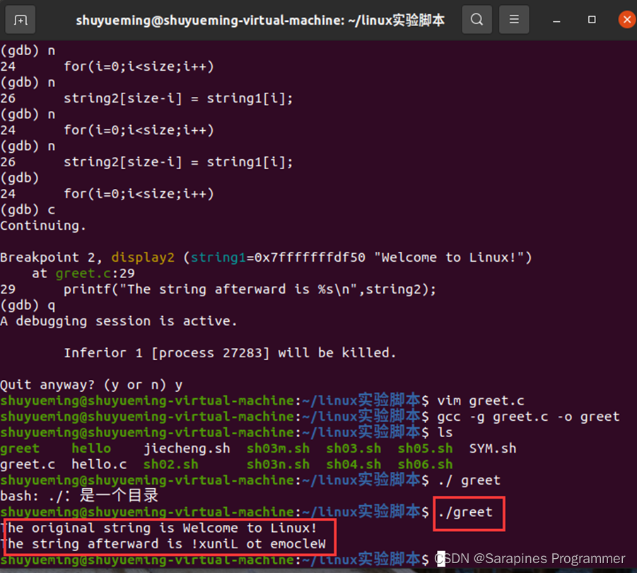 (1)使用文本编辑器输入以下代码greet.c。程序试图倒序输出main 函数中定义的字符串,但结果没有显示。