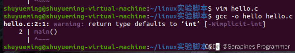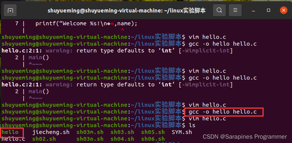 (2)编译文件: gcc -o hello hello.c。