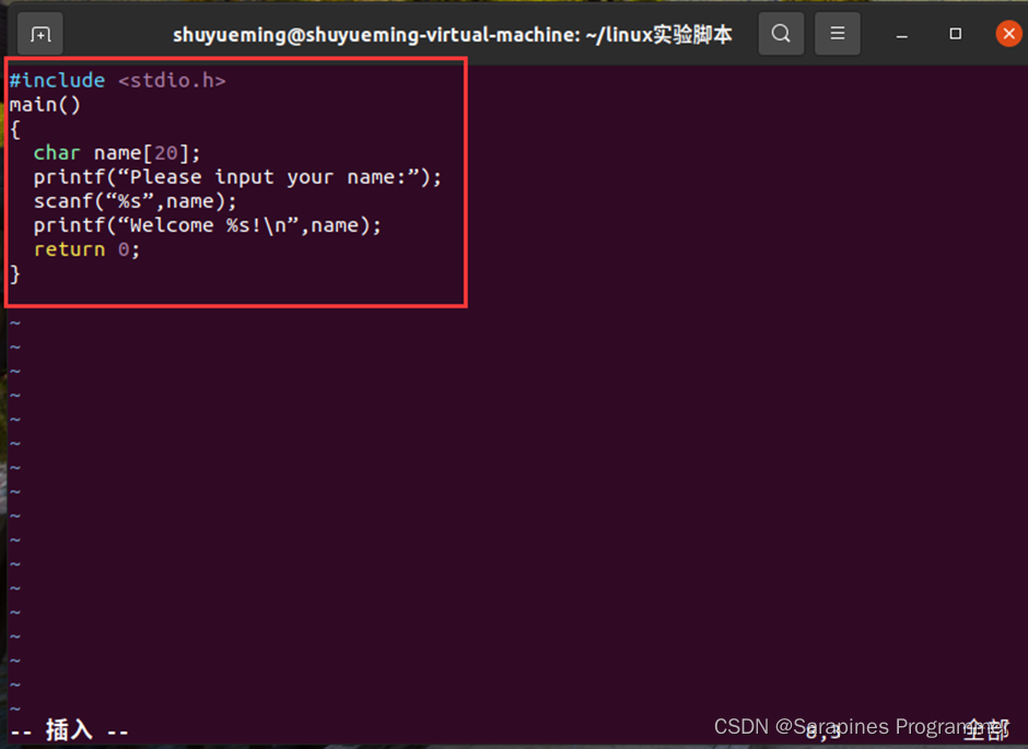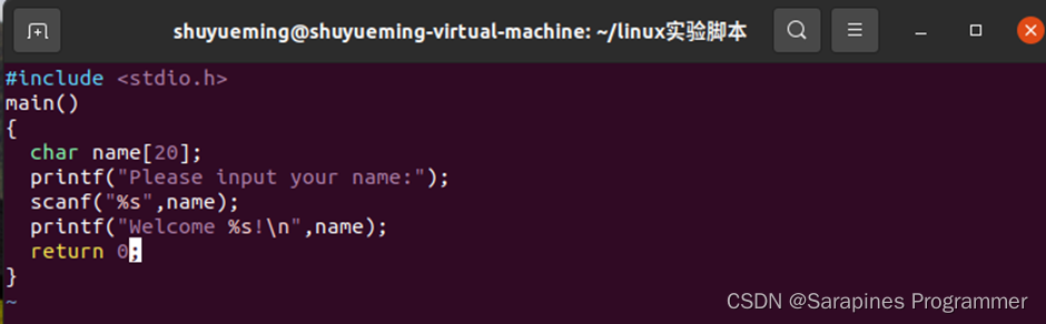 在终端输入vim greet.c,输入以上示例为: