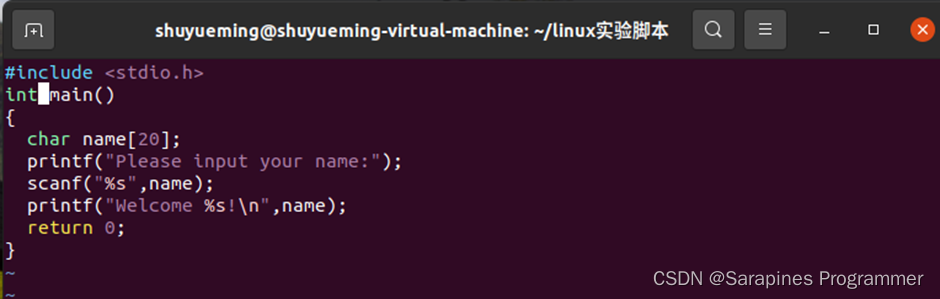 7 | printf(“Welcome %s!\n��,name);这一段显示源码的错误提示仍然是因为代码中使用了不可见的特殊字符,导致编译器无法识别。可以很容易发现源码中的printf(“Welcome %s!\n”,name);的双引号使用的是中文模式输入,故将其改成printf("Welcome %s!\n",name);