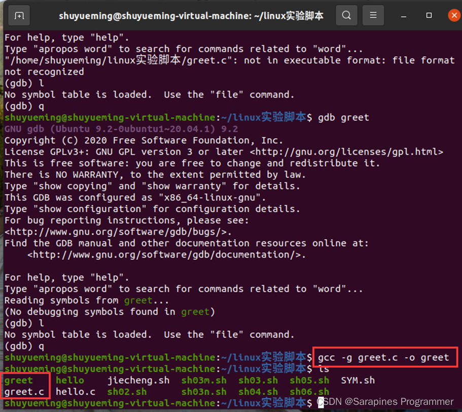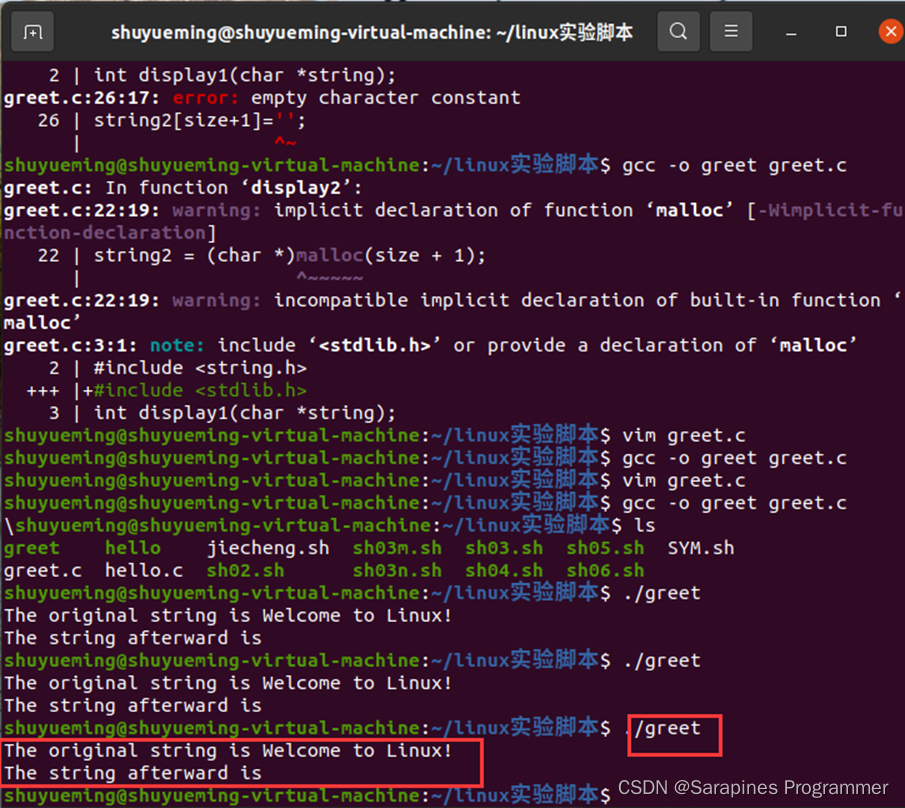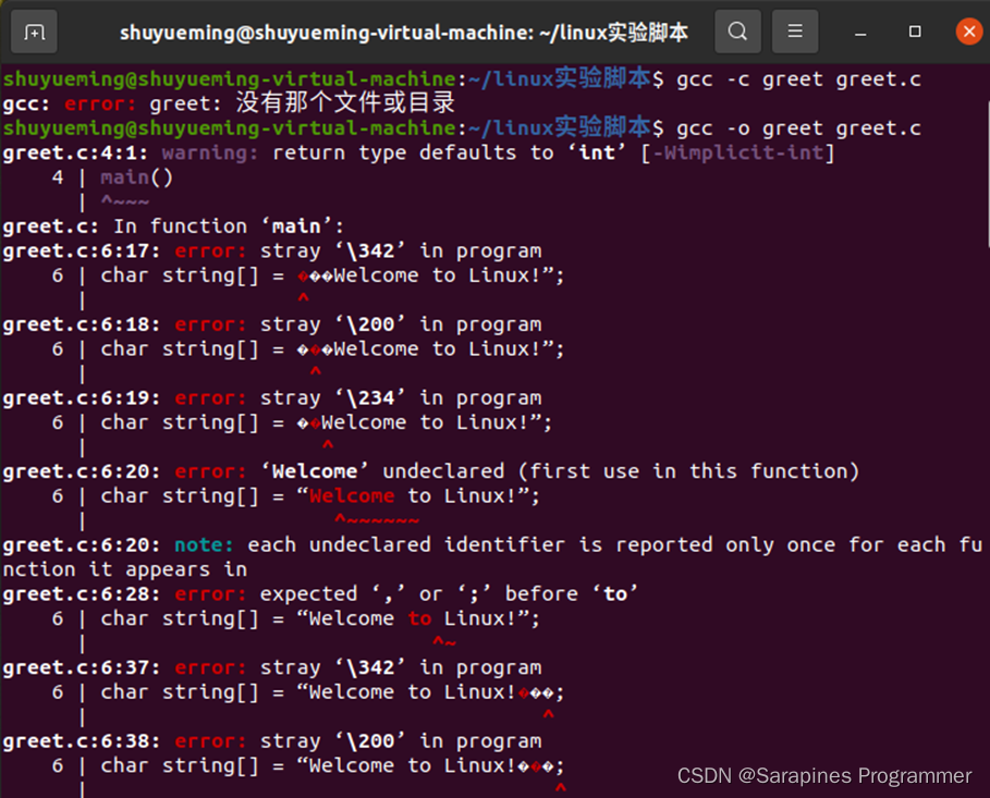 输入gcc -o greet greet.c进行编译结果如下: