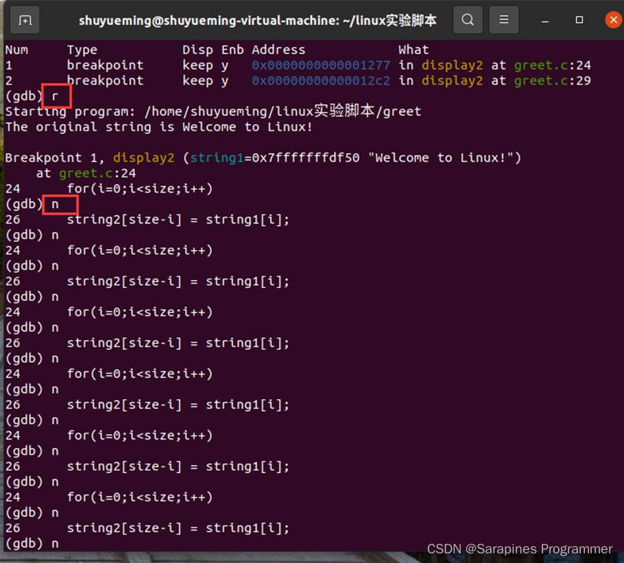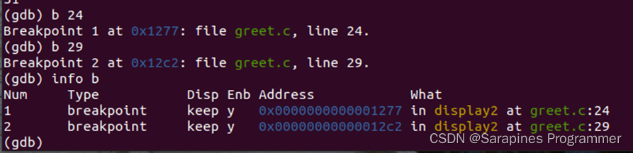 在23行(for循环处)设置断点:b 24;在29行(printf函数处)设置断点:b 29。此时输入info b查看断点设置情况。