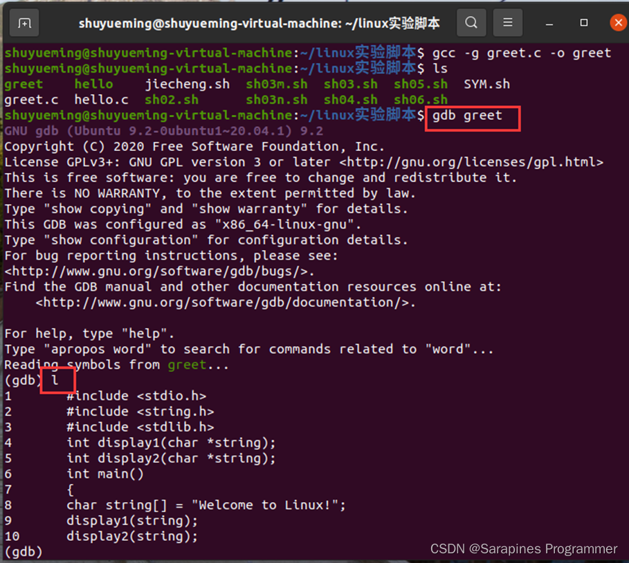 回到源码greet.c,我们根据报错信息分段分析。