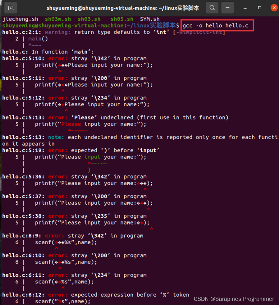 回到源码hello.c,我们根据报错信息分段分析。