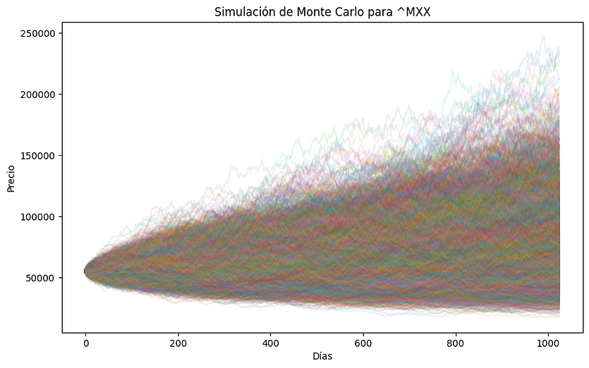 模拟将生成一个图表,显示股票的各种模拟价格路径。考虑到回报的历史可变性,这种方法提供了股票市场潜在未来情景的概率视图。