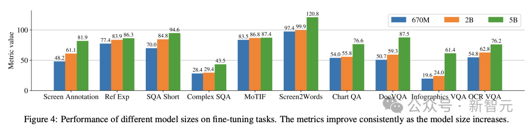 对于需要更复杂的视觉文本和算术推理的任务(例如InfoVQA、ChartQA和Complex ScreenQA),20亿参数模型和50亿参数模型之间的改进明显大于6.7亿参数模型和20亿参数模型。
