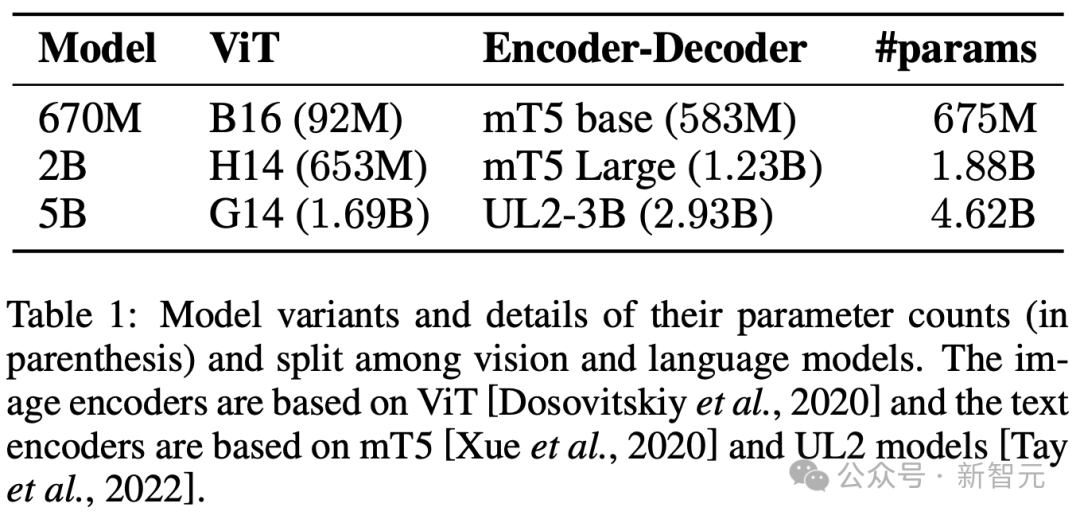 对于5B参数模型,从 PaLI-3的多模态预训练检查点开始,其中ViT与基于UL2的编码器-解码器语言模型一起训练。
