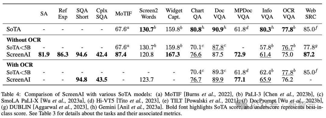 图4显示了ScreenAI模型的性能,并将其与各种与屏幕和信息图形相关的任务上的最新SOT结果进行了比较。