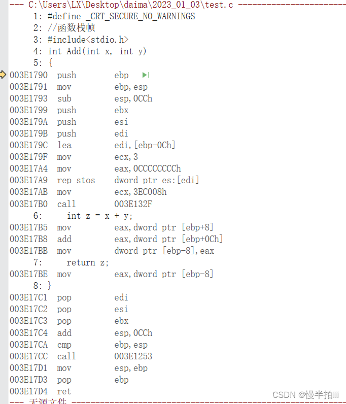 00BE1782 mov esp,ebp //再将Add函数的ebp的值赋值给esp,相当于回收了Add函数的栈帧空间