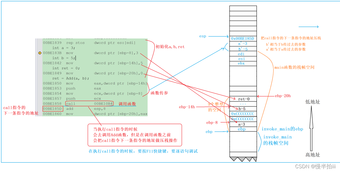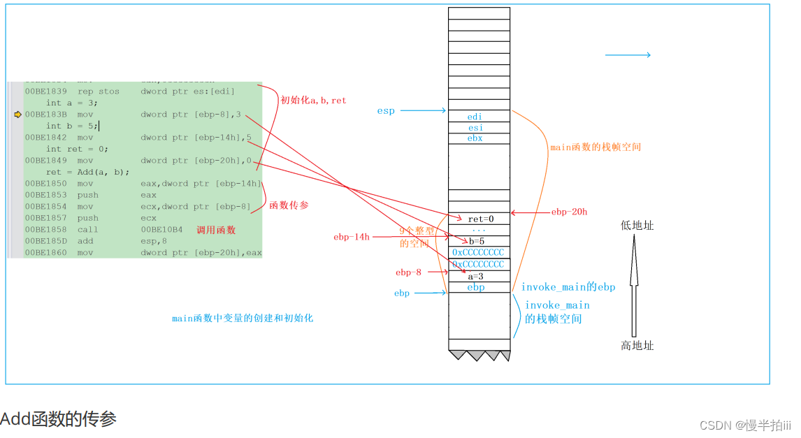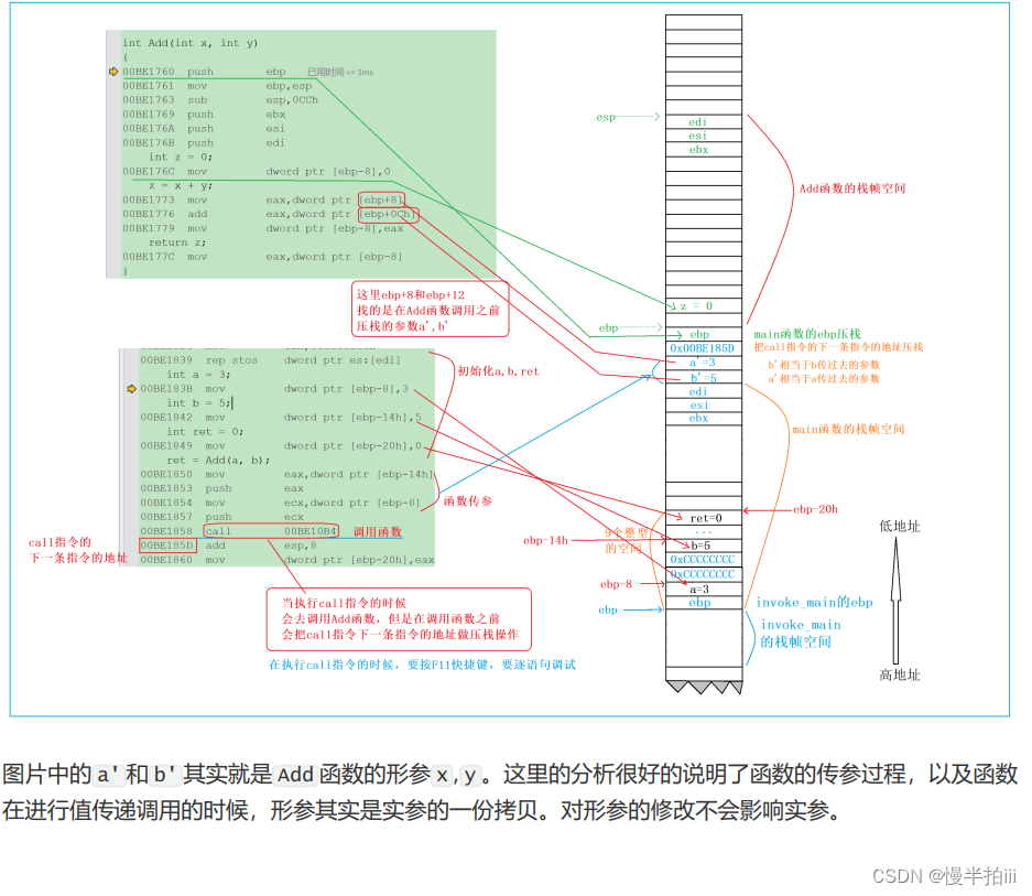 拓展了解: 其实返回对象时内置类型时,一般都是通过寄存器来带回返回值的,返回对象如果时较大的对象时,一般会在主调函数的栈帧中开辟一块空间,然后把这块空间的地址,隐式传递给被调函数,在被调函数中通过地址找到主调函数中预留的空间,将返回值直接保存到主调函数的。具体可以参考《程序员的自我修养》一书的第10章。到这里我们给大家完整的演示了main函数栈帧的创建,Add函数站真的额创建和销毁的过程,相信大家已经能够基本理解函数的调用过程,函数传参的方式,也能够回答课件开始处的问题了。