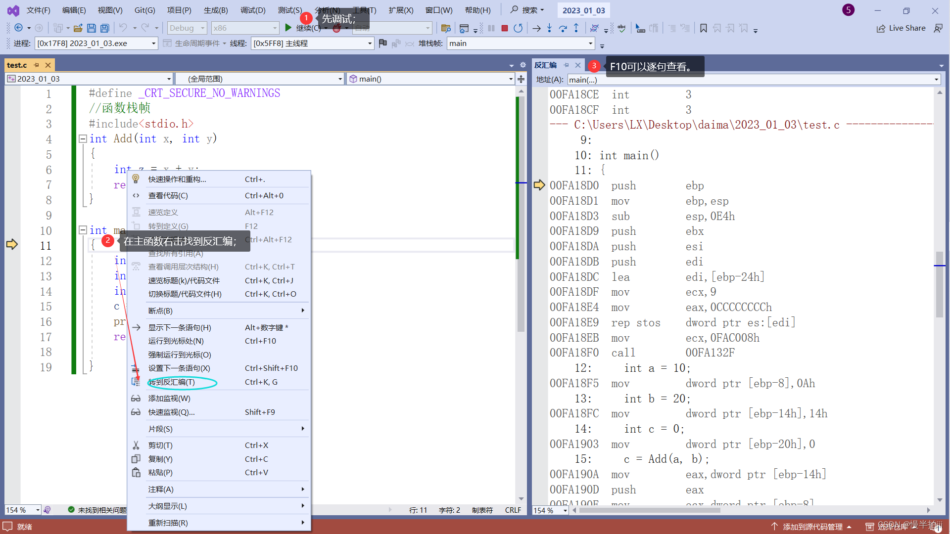 调试到 main 函数开始执行的第一行,右击鼠标转到反汇编。 注:VS编译器每次调试都会为程序重新分配内存,文中的反汇编代码是一次调试代码过程中数据,每次调试略有差异。