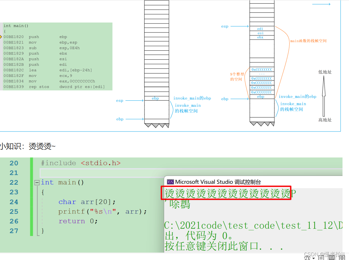 之所以上面的程序输出“烫”这么一个奇怪的字,是因为main函数调用时,在栈区开辟的空间的其中每一个字节都被初始化为0xCC,而arr数组是一个未初始化的数组,恰好在这块空间上创建的,0xCCCC(两个连续排列的0xCC)的汉字编码就是“烫”,所以0xCCCC被当作文本就是“烫”。