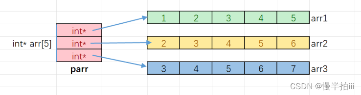 parr[i]是访问parr数组的元素,parr[i]找到的数组元素指向了整型⼀维数组,parr[i][j]就是整型⼀维数组中的元素。